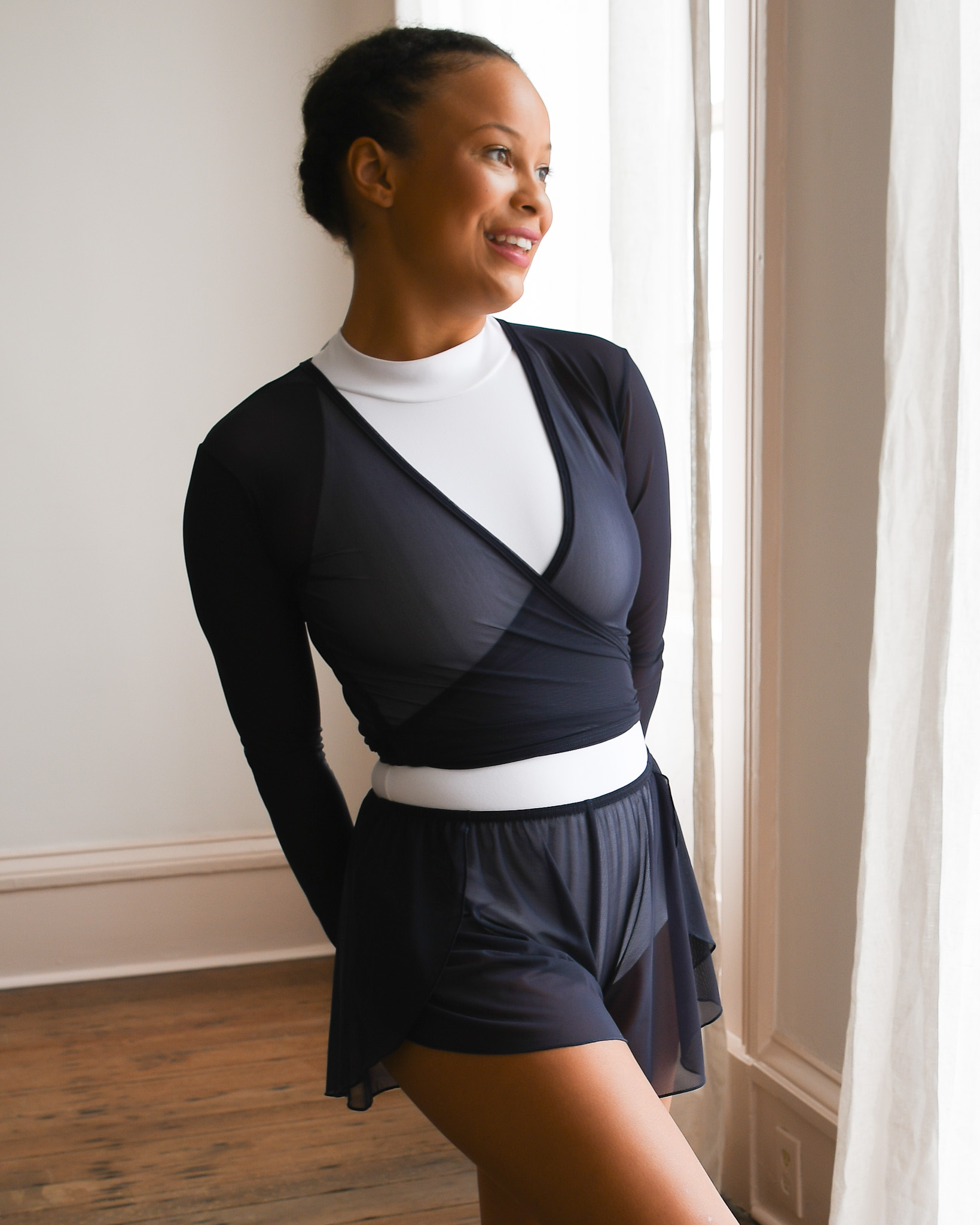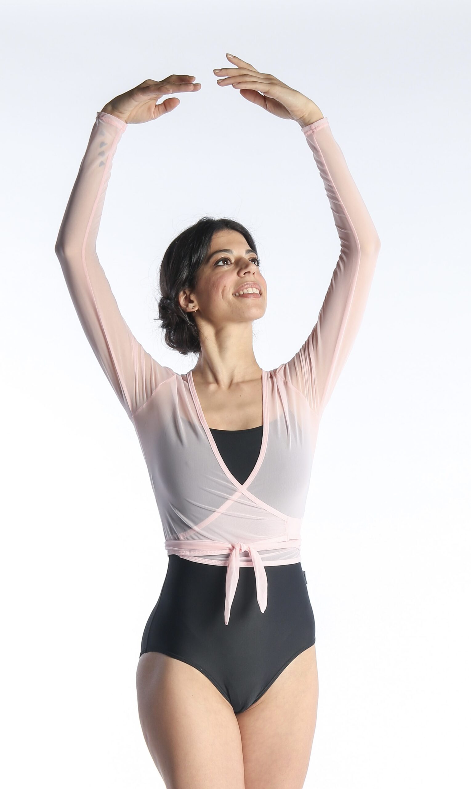 Classic ballerina style gets an update with this lightweight stretchy mesh wrap top! Semi-sheer and ultra flattering, this beautiful wrap top provides light coverage and ultra Ballet Beautiful style!