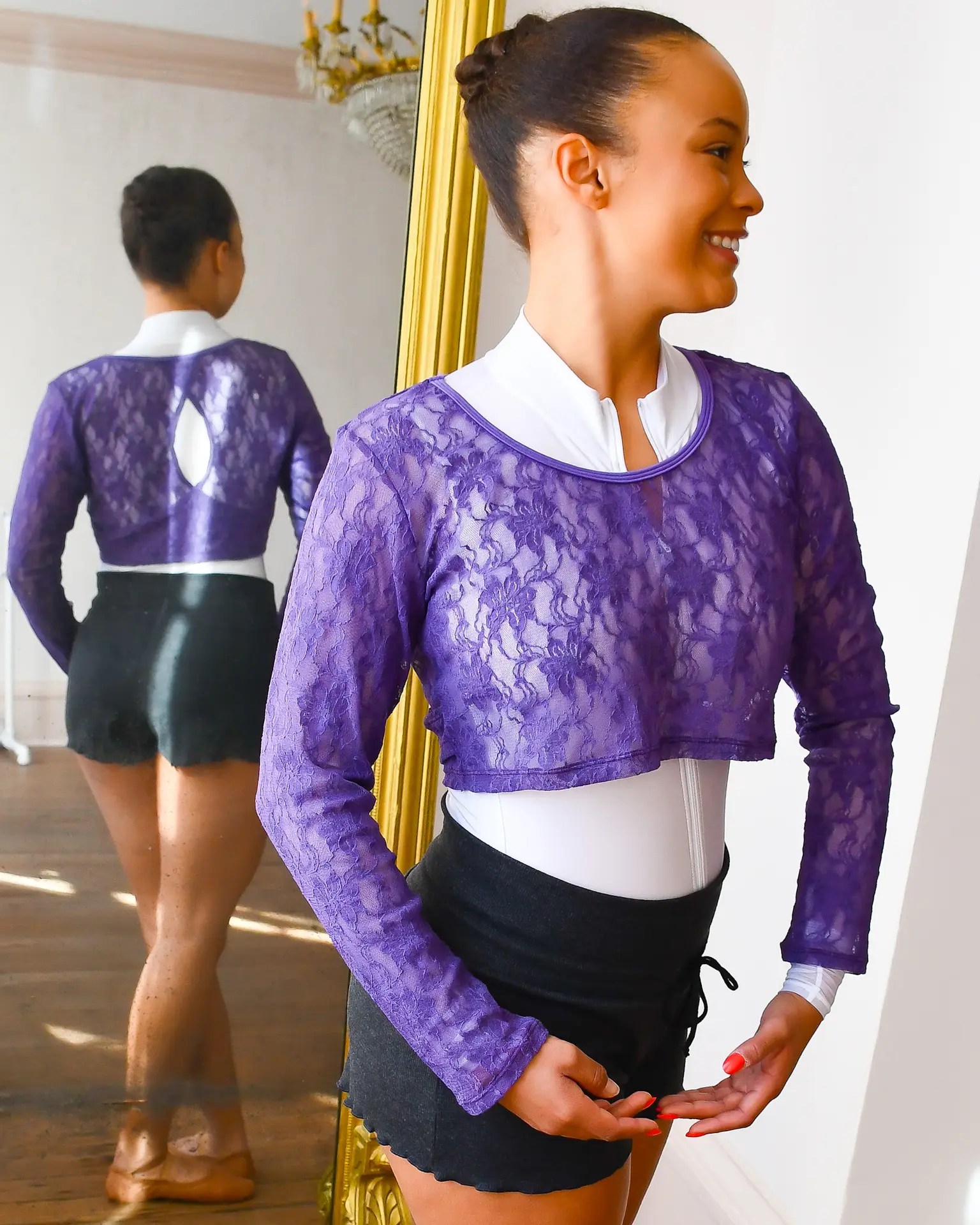 Your new favorite ballet core accessory! The Wisteria Studio Shrug features feminine, flexible and soft lace with a new chic style and peek-a-boo back.